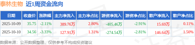 资金流向数据方面,本周泰林生物主力资金合计净流入517.67万元,游资资金合计净流出680.0万元,散户资金合计净流入162.33万元。本周资金流向一览见下表: