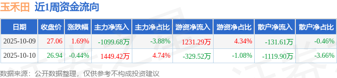 资金流向数据方面,本周玉禾田主力资金合计净流入349.74万元,游资资金合计净流入901.77万元,散户资金合计净流出1251.51万元。本周资金流向一览见下表: