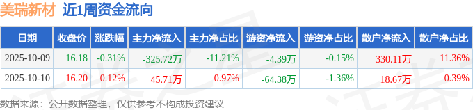 沪深股通持股方面,截止2025年10月10日收盘,美瑞新材深股通持股数为26.26万股,占流通股比为11.0%。
