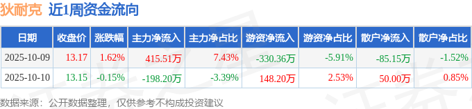 资金流向数据方面,本周狄耐克主力资金合计净流入217.31万元,游资资金合计净流出182.16万元,散户资金合计净流出35.15万元。本周资金流向一览见下表: