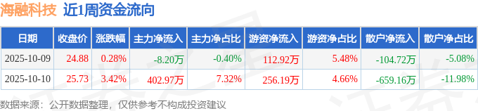 资金流向数据方面,本周海融科技主力资金合计净流入394.77万元,游资资金合计净流入369.11万元,散户资金合计净流出763.88万元。本周资金流向一览见下表: