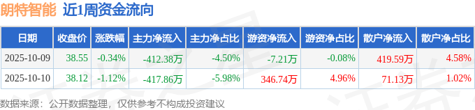 资金流向数据方面,本周朗特智能主力资金合计净流出830.24万元,游资资金合计净流入339.53万元,散户资金合计净流入490.71万元。本周资金流向一览见下表: