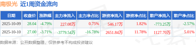 资金流向数据方面,本周南极光主力资金合计净流出3552.47万元,游资资金合计净流入3198.02万元,散户资金合计净流入354.45万元。本周资金流向一览见下表: