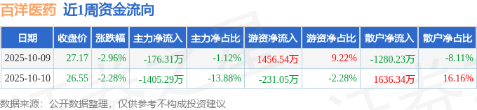 资金流向数据方面,本周百洋医药主力资金合计净流出1581.6万元,游资资金合计净流入1225.5万元,散户资金合计净流入356.11万元。本周资金流向一览见下表: