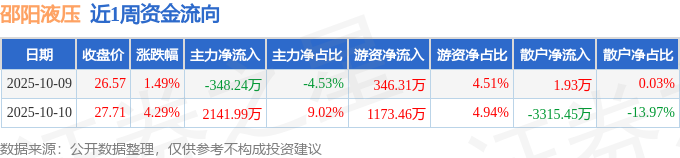 资金流向数据方面,本周邵阳液压主力资金合计净流入1793.75万元,游资资金合计净流入1519.77万元,散户资金合计净流出3313.53万元。本周资金流向一览见下表: