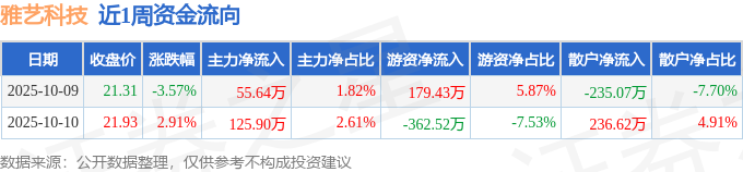 资金流向数据方面,本周雅艺科技主力资金合计净流入181.53万元,游资资金合计净流出183.09万元,散户资金合计净流入1.55万元。本周资金流向一览见下表:
