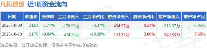 资金流向数据方面,本周凡拓数创主力资金合计净流出653.1万元,游资资金合计净流入628.34万元,散户资金合计净流入24.76万元。本周资金流向一览见下表: