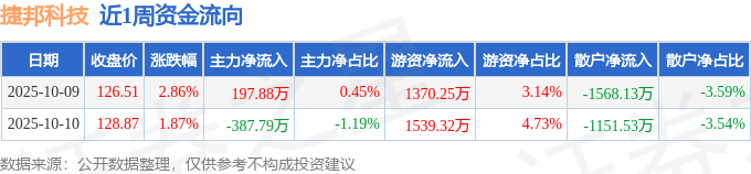 资金流向数据方面,本周捷邦科技主力资金合计净流出189.91万元,游资资金合计净流入2909.58万元,散户资金合计净流出2719.66万元。本周资金流向一览见下表: