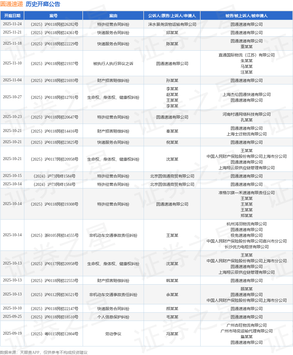 案号:(2024)沪73民终1584号根据统计,近一年内以圆通速递有限公司为当事人的历史开庭公告有161则,其中案由为“快递服务合同纠纷”的公告以37则居首,其次为“特许经营合同纠纷”有27则,“机动车交通事故责任纠纷”有14则。历史开庭公告(前20条)如下: