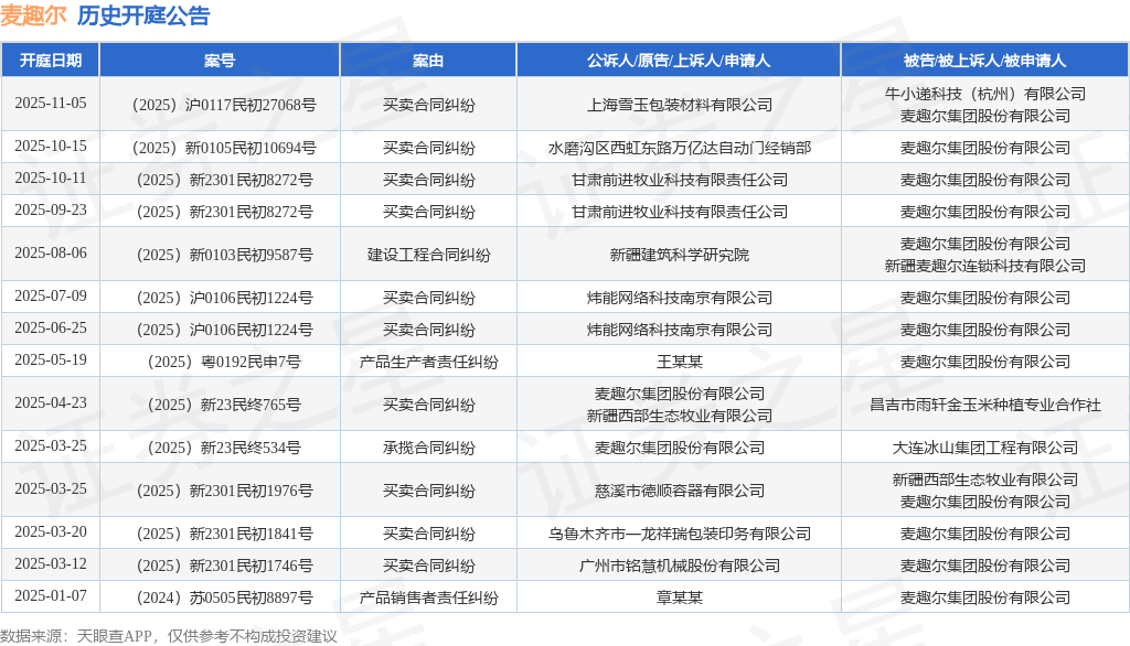 案号:(2025)新0105民初10694号根据统计,近一年内以麦趣尔集团股份有限公司为当事人的历史开庭公告有14则,其中案由为“买卖合同纠纷”的公告以10则居首,其次为“产品生产者责任纠纷”有1则,“产品销售者责任纠纷”有1则。历史开庭公告如下: