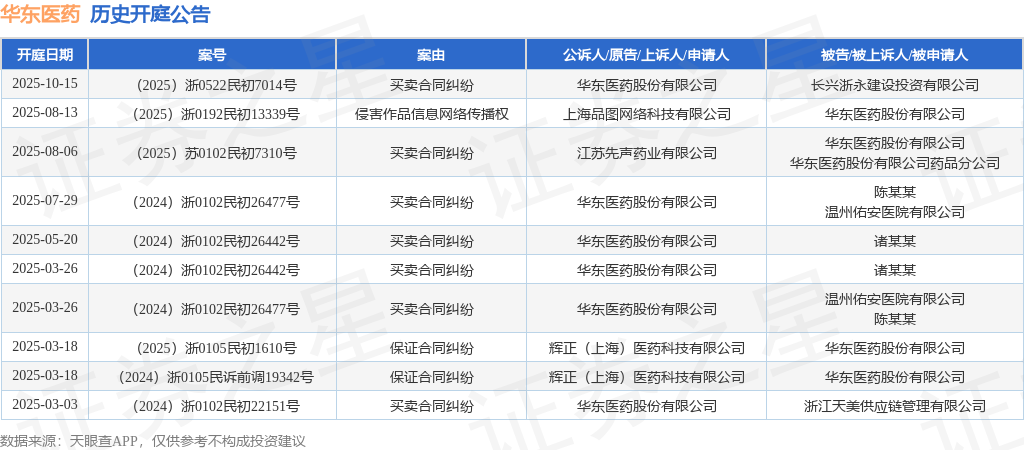 案号:(2025)浙0522民初7014号根据统计,近一年内以华东医药股份有限公司为当事人的历史开庭公告有10则,其中案由为“买卖合同纠纷”的公告以7则居首,其次为“保证合同纠纷”有2则,“侵害作品信息网络传播权”有1则。历史开庭公告如下: