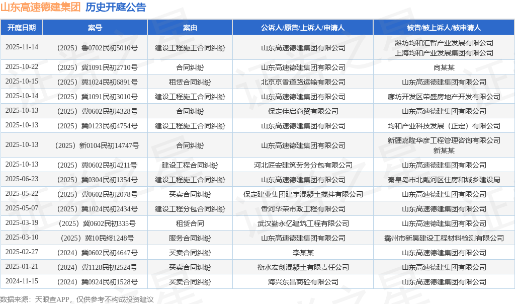 案号:(2025)冀1024民初6891号根据统计,近一年内以山东高速德建集团有限公司为当事人的历史开庭公告有16则,其中案由为“买卖合同纠纷”的公告以4则居首,其次为“建设工程施工合同纠纷”有4则,“合同纠纷”有3则。历史开庭公告如下: