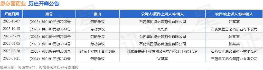 根据统计,近一年内以石药集团恩必普药业有限公司为当事人的历史开庭公告有6则,其中案由为“劳动争议”的公告以5则居首,其次为“建设工程施工合同纠纷”有1则。历史开庭公告如下: