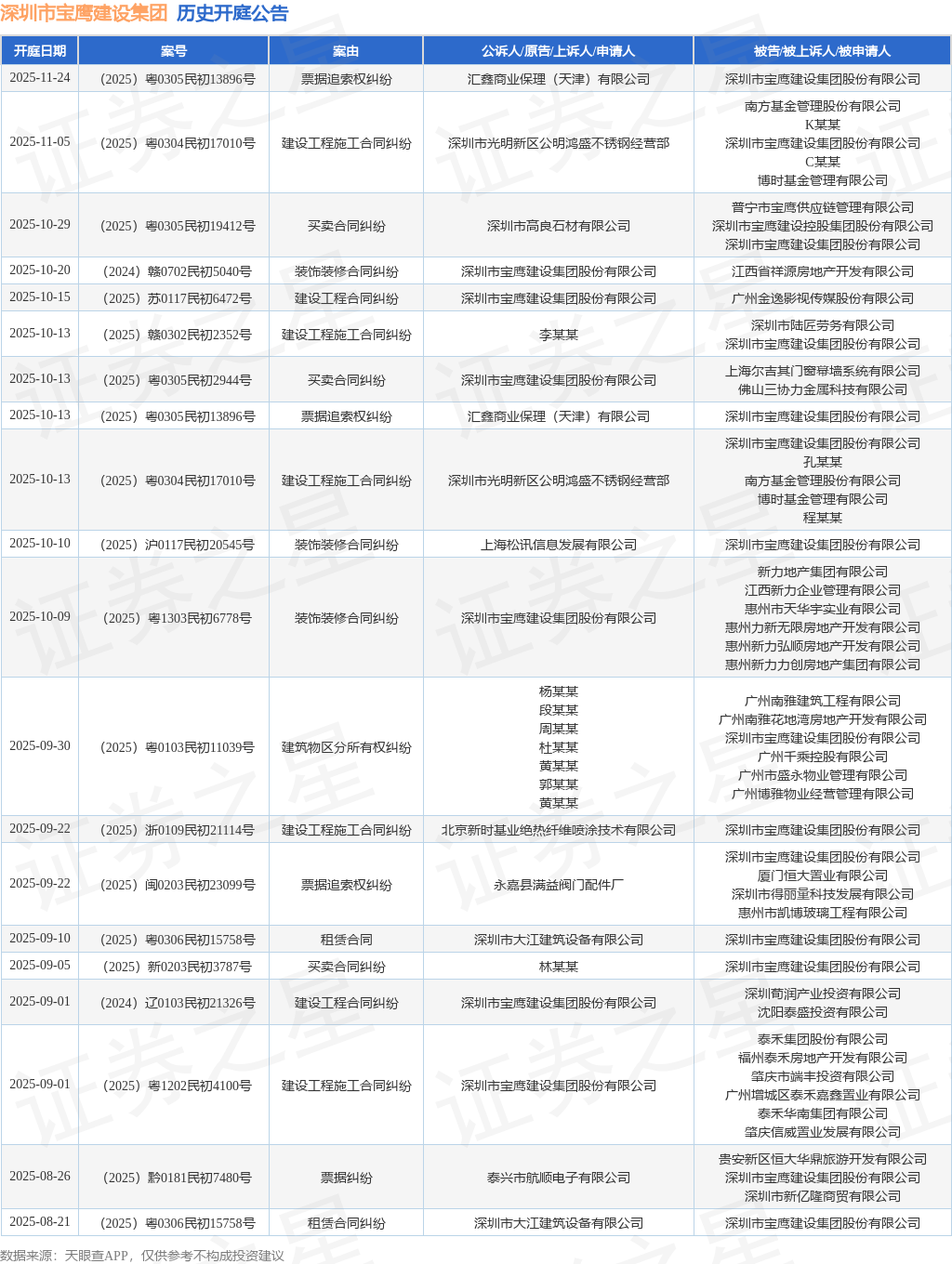 案号:(2025)苏0117民初6472号根据统计,近一年内以深圳市宝鹰建设集团股份有限公司为当事人的历史开庭公告有307则,其中案由为“买卖合同纠纷”的公告以110则居首,其次为“建设工程施工合同纠纷”有55则,“装饰装修合同纠纷”有40则。历史开庭公告(前20条)如下: