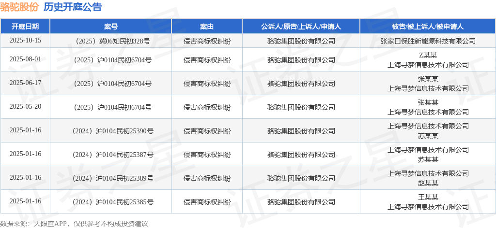 根据统计,近一年内以骆驼集团股份有限公司为当事人的历史开庭公告有8则,其中案由为“侵害商标权纠纷”的公告以8则居首。历史开庭公告如下:
