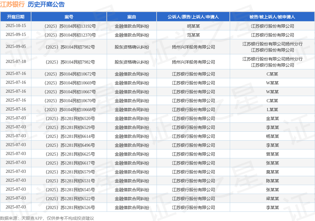 案号:(2025)苏0104民初13192号根据统计,近一年内以江苏银行股份有限公司为当事人的历史开庭公告有1133则,其中案由为“金融借款合同纠纷”的公告以1010则居首,其次为“信用卡纠纷”有110则,“名誉权纠纷”有4则。历史开庭公告(前20条)如下: