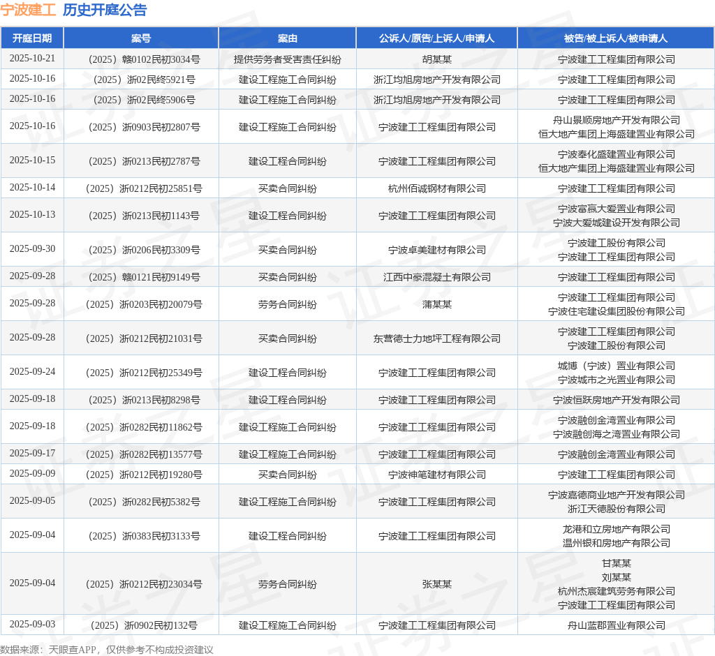 案号:(2025)浙0213民初2787号根据统计,近一年内以宁波建工工程集团有限公司为当事人的历史开庭公告有122则,其中案由为“买卖合同纠纷”的公告以33则居首,其次为“建设工程施工合同纠纷”有25则,“建设工程合同纠纷”有19则。历史开庭公告(前20条)如下: