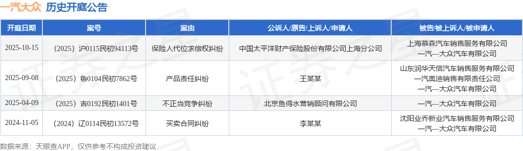 案号:(2025)沪0115民初94113号根据统计,近一年内以一汽—大众汽车有限公司为当事人的历史开庭公告有4则,其中案由为“不正当竞争纠纷”的公告以1则居首,其次为“买卖合同纠纷”有1则,“产品责任纠纷”有1则。历史开庭公告如下: