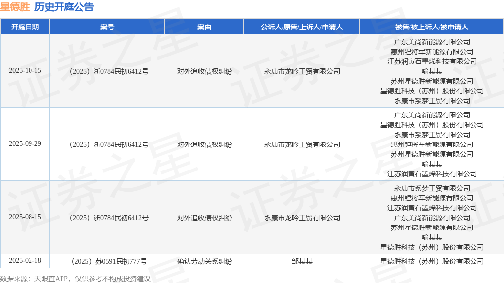 根据统计,近一年内以星德胜科技(苏州)股份有限公司为当事人的历史开庭公告有4则,其中案由为“对外追收债权纠纷”的公告以3则居首,其次为“确认劳动关系纠纷”有1则。历史开庭公告如下: