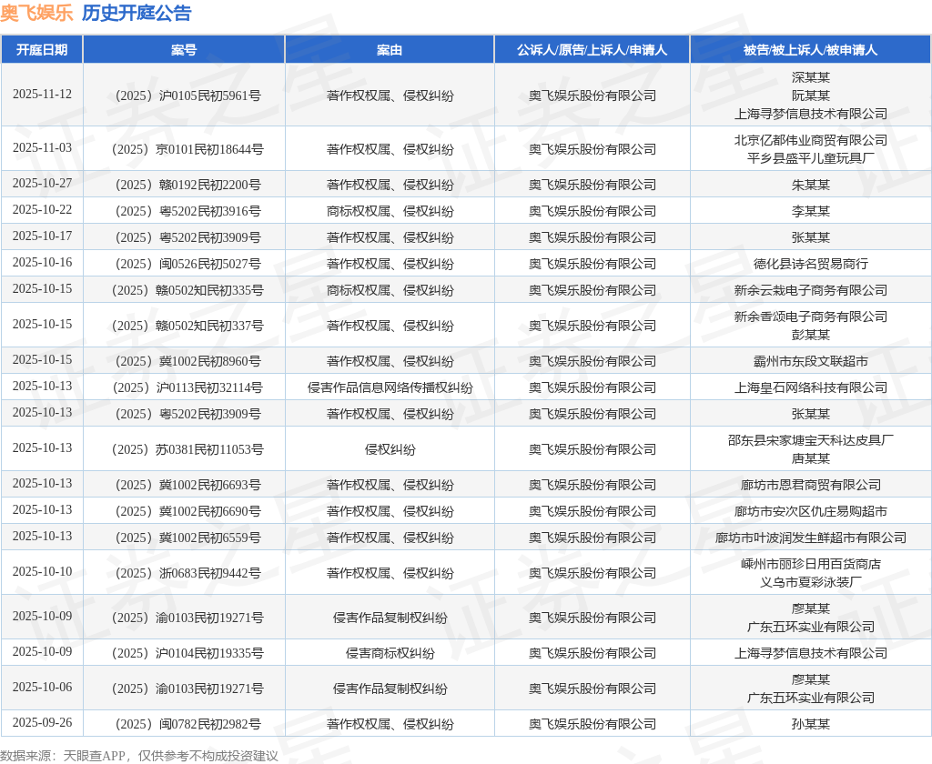 案号:(2025)赣0502知民初335号根据统计,近一年内以奥飞娱乐股份有限公司为当事人的历史开庭公告有450则,其中案由为“著作权权属、侵权纠纷”的公告以226则居首,其次为“侵害作品发行权纠纷”有57则,“侵害作品信息网络传播权纠纷”有30则。历史开庭公告(前20条)如下: