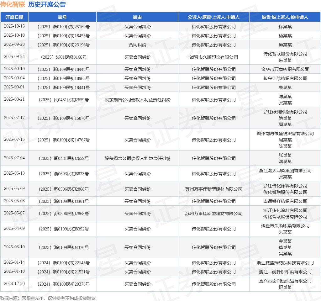 案号:(2025)浙0109民初25169号根据统计,近一年内以传化智联股份有限公司为当事人的历史开庭公告有20则,其中案由为“买卖合同纠纷”的公告以17则居首,其次为“股东损害公司债权人利益责任纠纷”有2则,“合同纠纷”有1则。历史开庭公告如下: