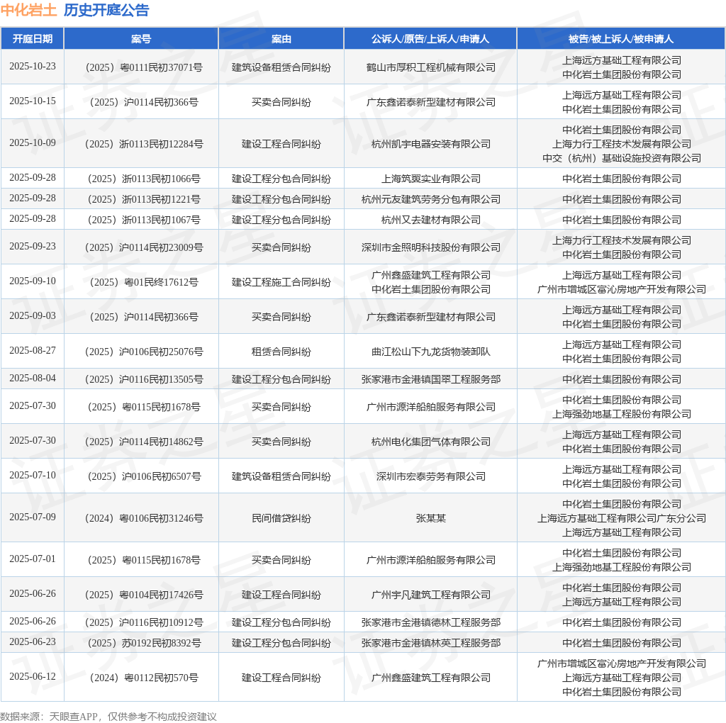 案号:(2025)沪0114民初366号根据统计,近一年内以中化岩土集团股份有限公司为当事人的历史开庭公告有46则,其中案由为“建设工程分包合同纠纷”的公告以9则居首,其次为“建设工程合同纠纷”有9则,“买卖合同纠纷”有8则。历史开庭公告(前20条)如下: