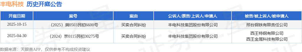 证券之星消息,根据天眼查APP显示,近日公布了一则丰电科技集团股份有限公司作为原告/上诉人的开庭公告,详细内容如下:
