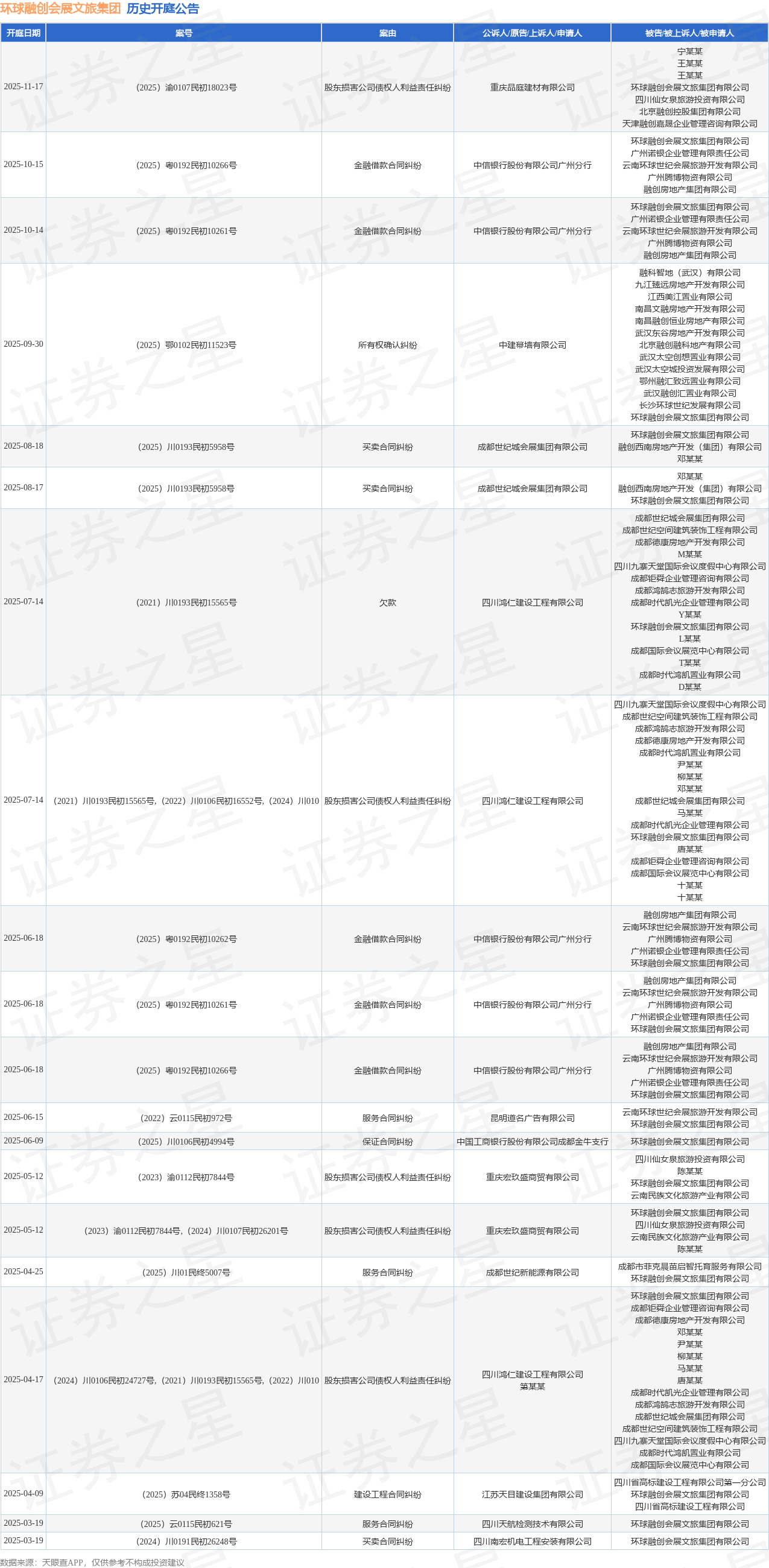 案号:(2025)粤0192民初10266号根据统计,近一年内以环球融创会展文旅集团有限公司为当事人的历史开庭公告有38则,其中案由为“票据追索权纠纷”的公告以8则居首,其次为“股东损害公司债权人利益责任纠纷”有6则,“服务合同纠纷”有5则。历史开庭公告(前20条)如下: