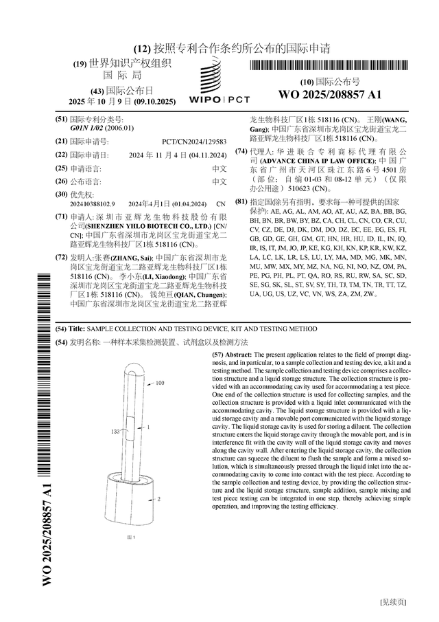证券之星消息,根据企查查数据显示亚辉龙(688575)公布了一项国际专利申请,专利名为“一种样本采集检测装置、试剂盒以及检测方法”,专利申请号为PCT/CN2024/129583,国际公布日为2025年10月9日。