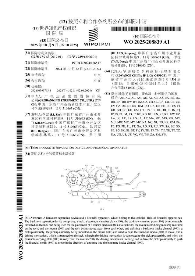 证券之星消息,根据企查查数据显示广电运通(002152)公布了一项国际专利申请,专利名为“分钞装置和金融设备”,专利申请号为PCT/CN2024/126517,国际公布日为2025年10月9日。