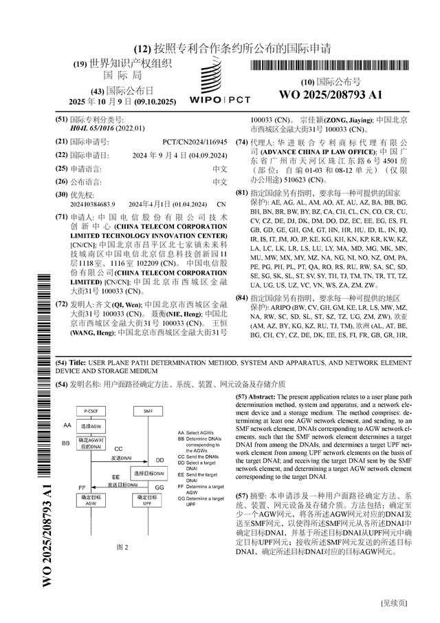 证券之星消息,根据企查查数据显示中国电信(601728)公布了一项国际专利申请,专利名为“用户面路径确定方法、系统、装置、网元设备及存储介质”,专利申请号为PCT/CN2024/116945,国际公布日为2025年10月9日。
