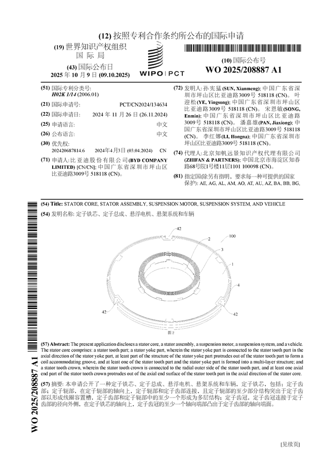 证券之星消息,根据企查查数据显示比亚迪(002594)公布了一项国际专利申请,专利名为“定子铁芯、定子总成、悬浮电机、悬架系统和车辆”,专利申请号为PCT/CN2024/134634,国际公布日为2025年10月9日。