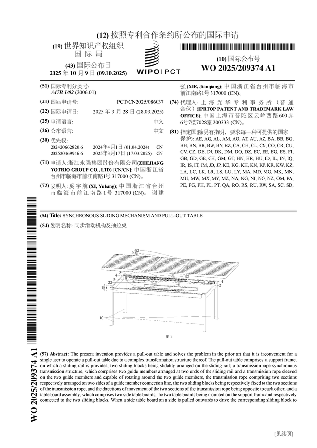 证券之星消息,根据企查查数据显示浙江永强(002489)公布了一项国际专利申请,专利名为“同步滑动机构及抽拉桌”,专利申请号为PCT/CN2025/086037,国际公布日为2025年10月9日。
