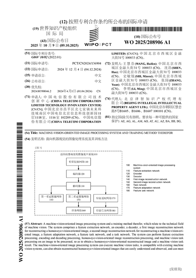证券之星消息,根据企查查数据显示中国电信(601728)公布了一项国际专利申请,专利名为“面向机器视觉的图像处理系统及其训练方法”,专利申请号为PCT/CN2024/136904,国际公布日为2025年10月9日。