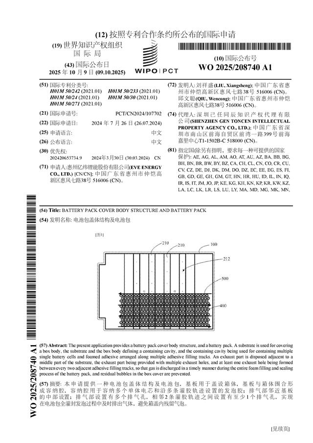 证券之星消息,根据企查查数据显示亿纬锂能(300014)公布了一项国际专利申请,专利名为“电池包盖体结构及电池包”,专利申请号为PCT/CN2024/107702,国际公布日为2025年10月9日。