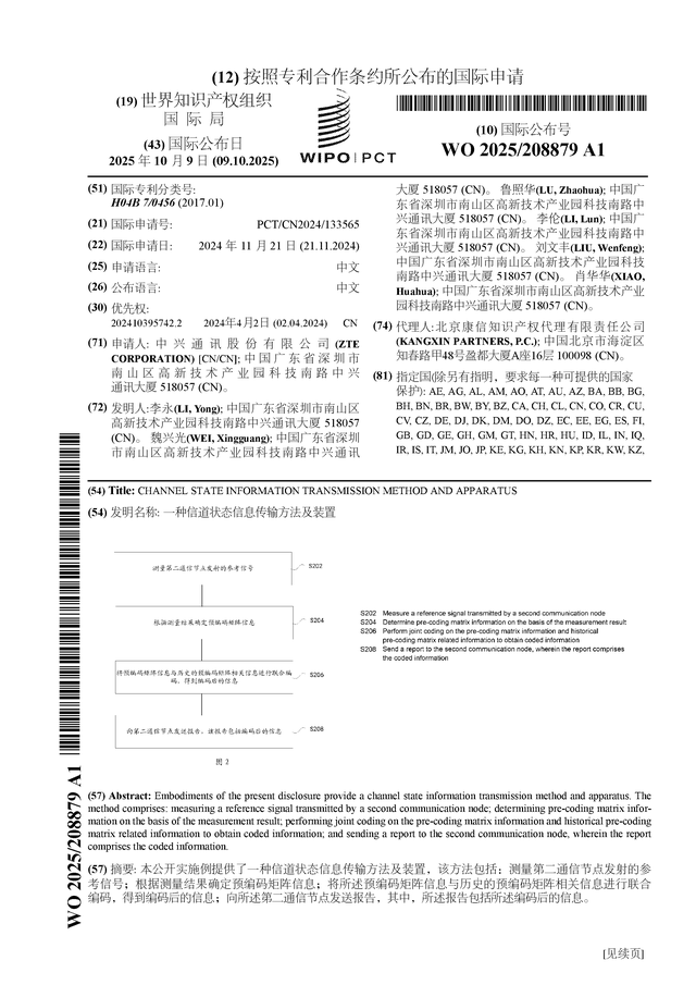证券之星消息,根据企查查数据显示中兴通讯(000063)公布了一项国际专利申请,专利名为“一种信道状态信息传输方法及装置”,专利申请号为PCT/CN2024/133565,国际公布日为2025年10月9日。