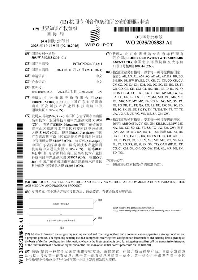 证券之星消息,根据企查查数据显示中兴通讯(000063)公布了一项国际专利申请,专利名为“信令发送方法和接收方法、通信装置、存储介质及程序产品”,专利申请号为PCT/CN2024/134241,国际公布日为2025年10月9日。