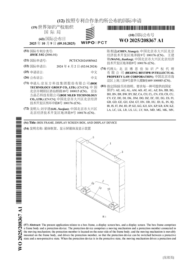 证券之星消息,根据企查查数据显示京东方A(000725)公布了一项国际专利申请,专利名为“箱体框架、显示屏箱体及显示装置”,专利申请号为PCT/CN2024/085662,国际公布日为2025年10月9日。