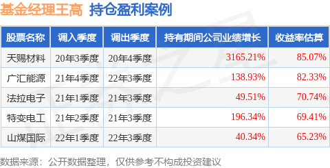 王高管理的中邮中证500指数增强A基金在20年3季度买入天赐材料,在持有1个季度后在20年4季度卖出。持有期间的估算收益率为85.07%,持有期间天赐材料在2019年到2020年的年报归属净利润增幅达3165.21%。