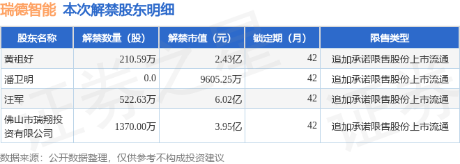 证券之星消息,根据市场公开信息整理,瑞德智能(301135)于10月13日将有2103.22万股限售股份解禁,为公司追加承诺限售股份上市流通,占公司总股本20.63%。(本次数据根据历史公告整理得出,实际情况以上市公司最新公告为准)最近一年内,该股累计解禁613.2万股,占总股本的6.01%。本次解禁后,公司还有2549.12万股限售股份,占总股本25.0%。具体如下图所示: