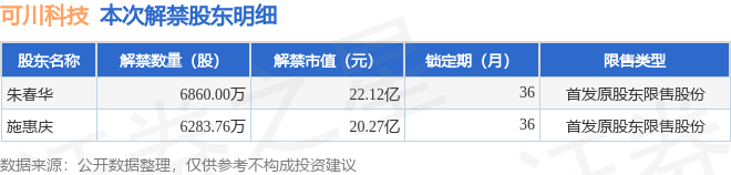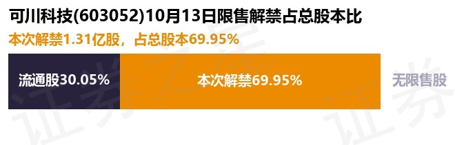 证券之星消息,根据市场公开信息整理,可川科技(603052)于10月13日将有1.31亿股限售股份解禁,为公司首发原股东限售股份,占公司总股本69.95%。(本次数据根据历史公告整理得出,实际情况以上市公司最新公告为准)本次解禁后,公司已无限售股份。具体如下图所示: