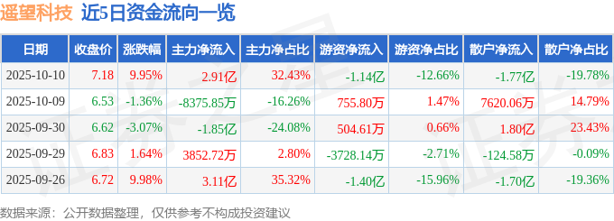 证券之星消息,截至2025年10月10日收盘,遥望科技(002291)报收于7.18元,上涨9.95%,涨停,换手率15.01%,成交量130.42万手,成交额8.97亿元。