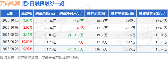 证券之星消息,截至2025年10月10日收盘,万向钱潮(000559)报收于11.74元,下跌9.9%,换手率8.01%,成交量265.48万手,成交额32.11亿元。