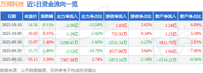证券之星消息,截至2025年10月10日收盘,万润科技(002654)报收于14.56元,下跌9.11%,换手率14.45%,成交量122.16万手,成交额18.0亿元。