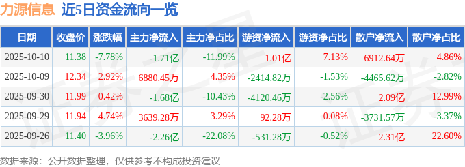证券之星消息,截至2025年10月10日收盘,力源信息(300184)报收于11.38元,下跌7.78%,换手率11.67%,成交量122.46万手,成交额14.23亿元。