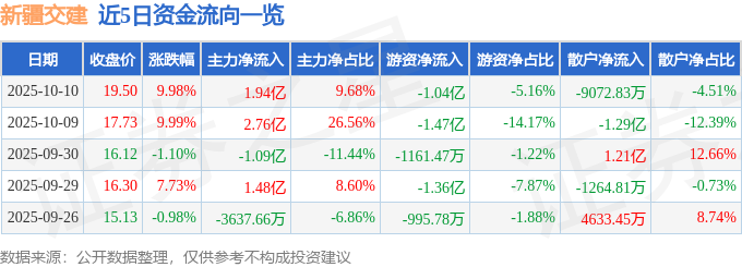 证券之星消息,截至2025年10月10日收盘,新疆交建(002941)报收于19.5元,上涨9.98%,已连续涨停2天,换手率14.35%,成交量104.75万手,成交额20.1亿元。