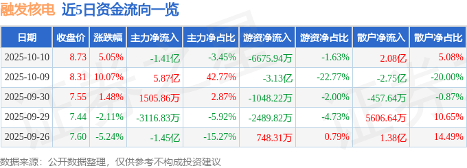 证券之星消息,截至2025年10月10日收盘,融发核电(002366)报收于8.73元,上涨5.05%,换手率37.34%,成交量469.16万手,成交额40.88亿元。