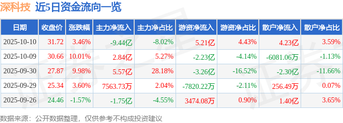 证券之星消息,截至2025年10月10日收盘,深科技(000021)报收于31.72元,上涨3.46%,换手率24.63%,成交量385.89万手,成交额117.7亿元。