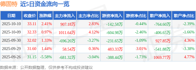 证券之星消息,截至2025年10月10日收盘,德固特(300950)报收于33.11元,上涨2.41%,换手率10.83%,成交量9.79万手,成交额3.21亿元。