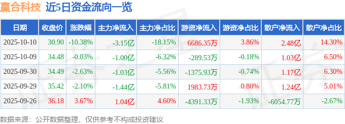 证券之星消息,截至2025年10月10日收盘,赢合科技(300457)报收于30.9元,下跌10.38%,换手率8.61%,成交量54.93万手,成交额17.34亿元。